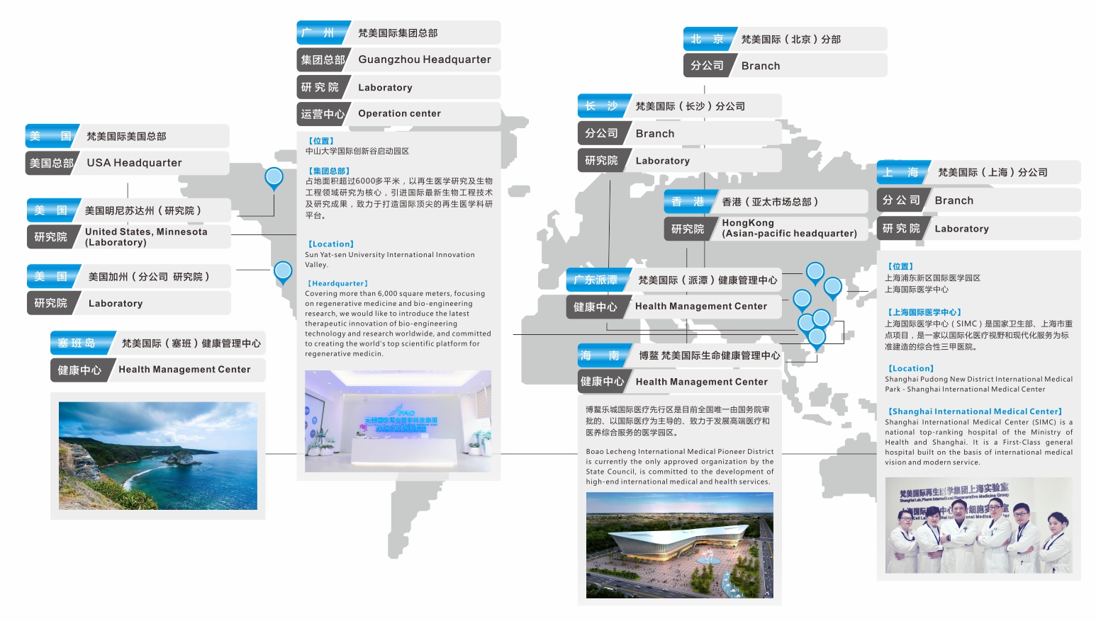 梵美国际再生医学科技有限公司,投资过亿,总部位于广州,占地6000平米,在美国、香港、广州、北京、上海、海南分别设立分支机构。