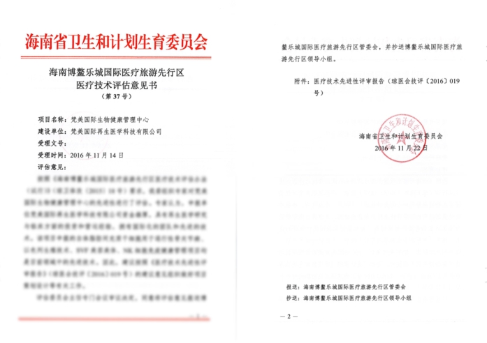 梵美国际生命健康管理中心位于海南博鳌乐城国际医疗旅游先行区,项目占地3万余平方米,并获得国际资本德国ADT医疗基金、以色列SHERPA医疗领域创投基金的投入,总投资金额超过十亿元。本中心关于间充质干细胞用于退行性关节病、IVF生殖技术、SVF美容美体、NK细胞免疫健康管理四大项目全面通过了国内顶尖专家的先进性评审,获批通过特许临床机构,并按功能划分为再生医学研究中心、辅助生殖中心、抗衰老中心、健康管理中心,将是国内最大的生物健康管理中心之一。