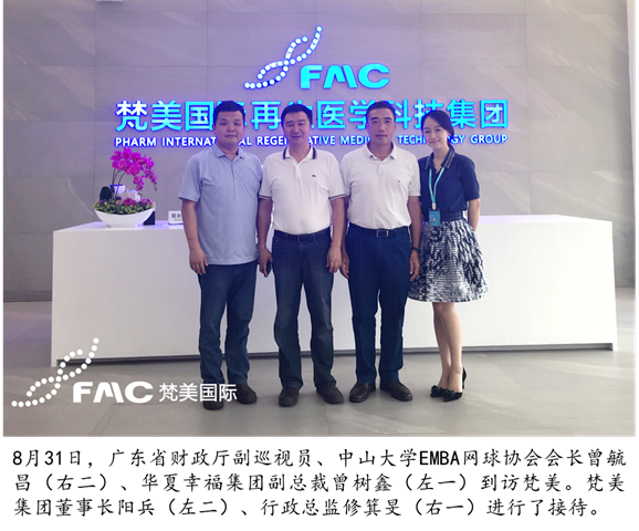 8月31日,广东省财政厅副巡视员、中山大学EMBA网球协会会长曾毓昌、华夏幸福集团副总裁曾树鑫到访梵美国际再生医学科技集团。
