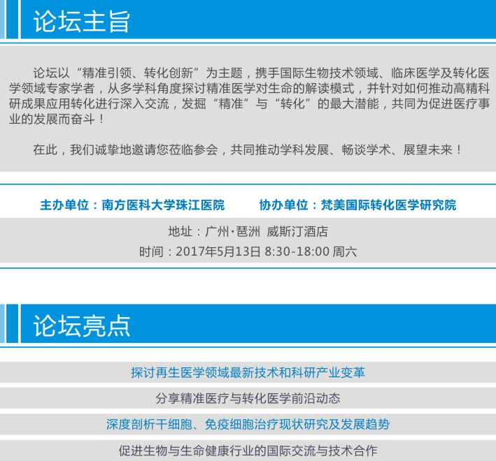 以“精准引领、转化创新”为主题的“2017第一届国际(广州)精准医疗与转化医学论坛”即将在5月13日广州广交会威斯汀酒店举行,本次论坛由南方医科大学珠江医院主办,梵美国际转化医学研究院协办,携手国内外生物技术领域、临床医学及转化医学领域的专家学者(陈虎/于力/阳剑波/邵永照/黄刚/宾亮华/徐洋/李玉华等),从多学科角度探讨精准医学对生命的解读模式,并针对如何推动高精科研成果应用转化进行深入交流。